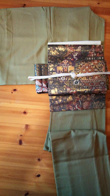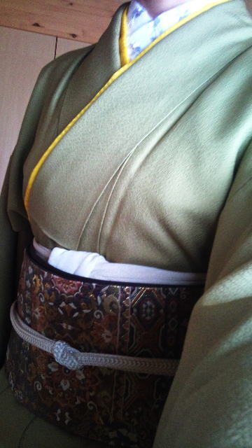 ▼着物はお抹茶色をちょっと薄くした縮緬寿光織り