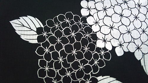 江戸染めの白地に藍or藍地に白、あるいは華やかなピンクや紫の色つきのあじさいは結構見るんですが、まぁ、確かにコレは「面白系」だと思われます。
