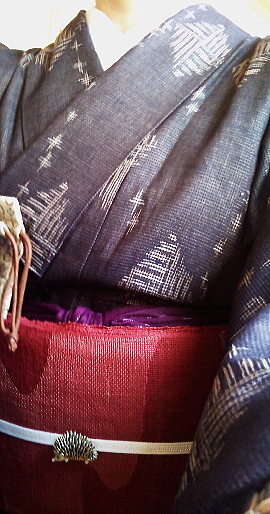 先週末、綿紬の一張羅の夏着物に、「紗」の帯を合わせてみました。