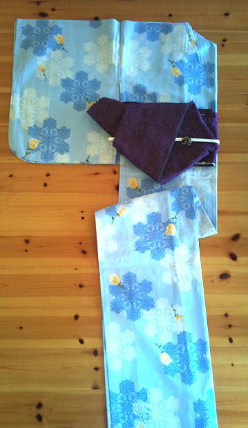 レースっぽい雪輪模様+黄色い薔薇の蕾柄 の明るい水色ゆかた。生地は綿100%の紅梅地でさらりとしてます。