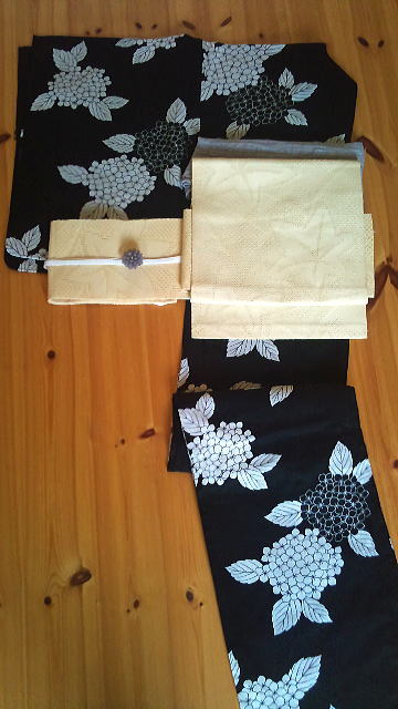 ▼ 去年買った黒地のあじさい柄。帯はアイボリーのレース作り帯