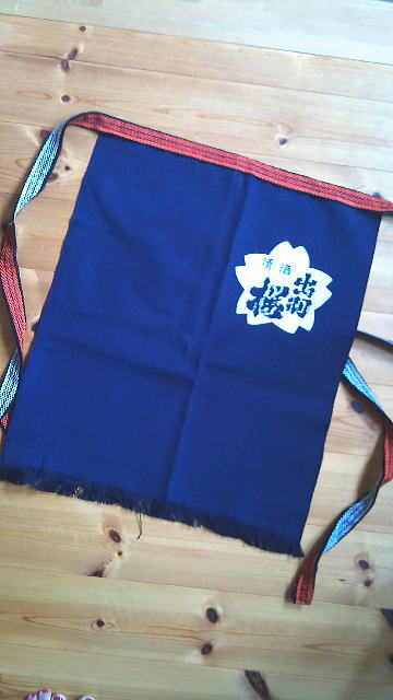 これはワタクシの激愛する「出羽桜酒造」の前掛けです。ここの吟醸酒は、そりゃもう、最高であります♪