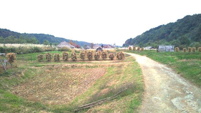 ここら辺では今でも天然干しの米は、田んぼに杭を打ったものに、稲わらをこうやって挿しております。